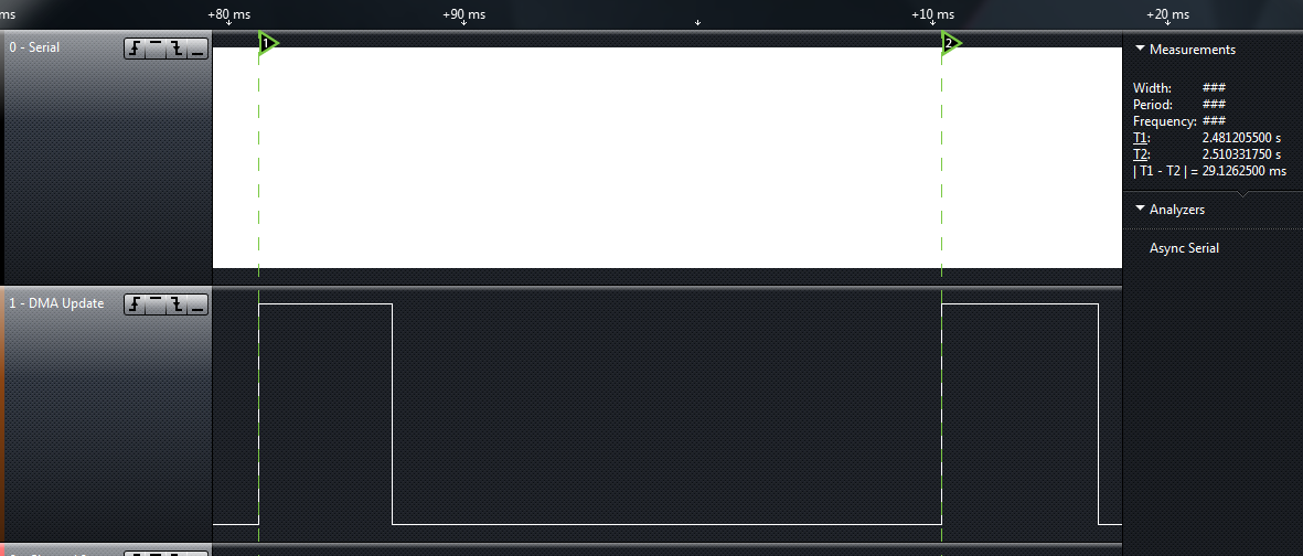 It only consumes 0.02% CPU and uses 12 threads when the CPU is running at 760MHz. 29ms per pack gives 34 packs/sec, so in total we get 34000 values/sec (32bit value) UART/DMA timing